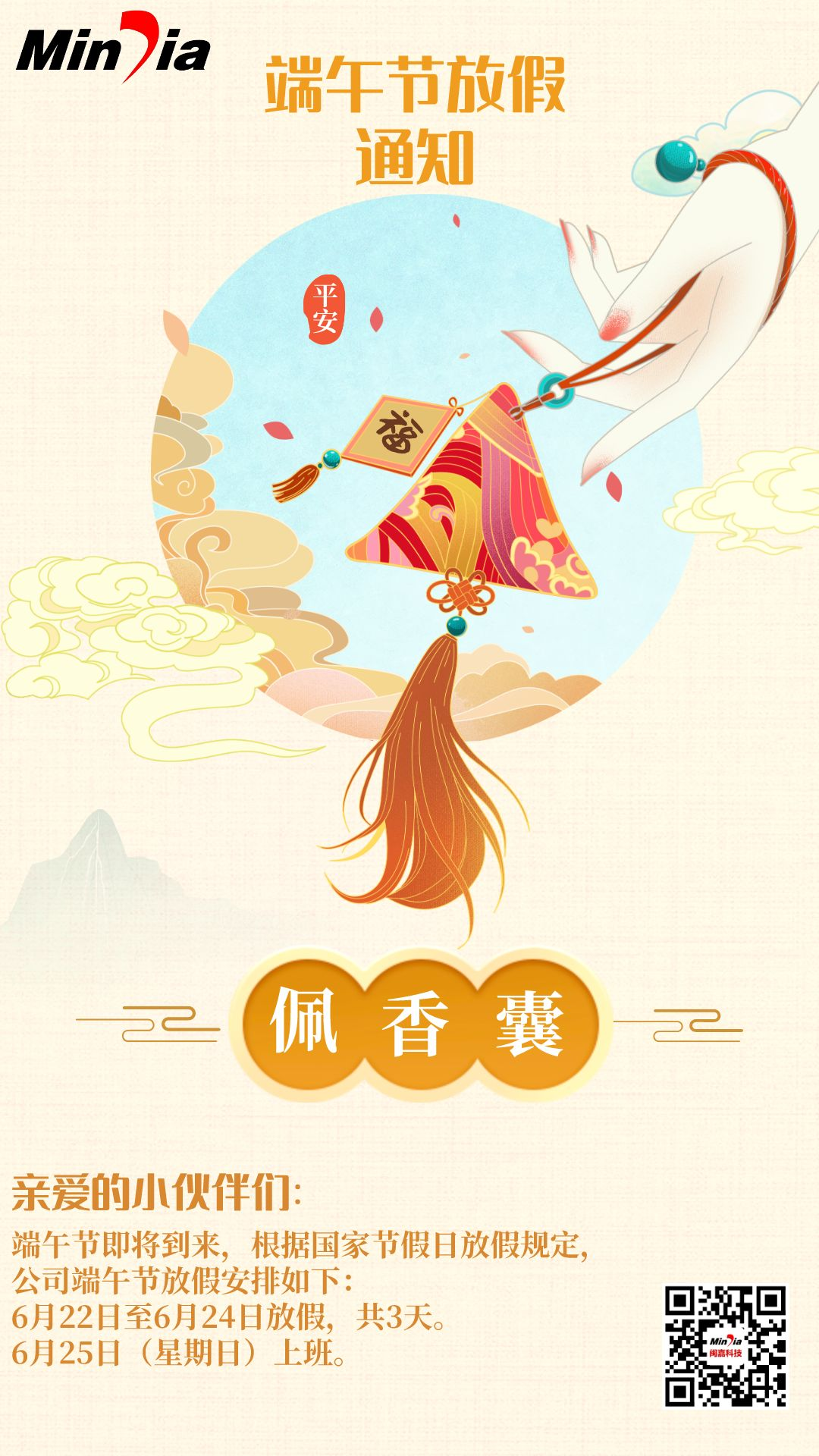 【概要描述】親愛的小伙伴們: 端午節(jié)即將到來,根據(jù)國家節(jié)假日放假規(guī)定公司端午節(jié)放假安排如下: 6月22日至6月24日放假,共3天。6月25日(星期日)上班。